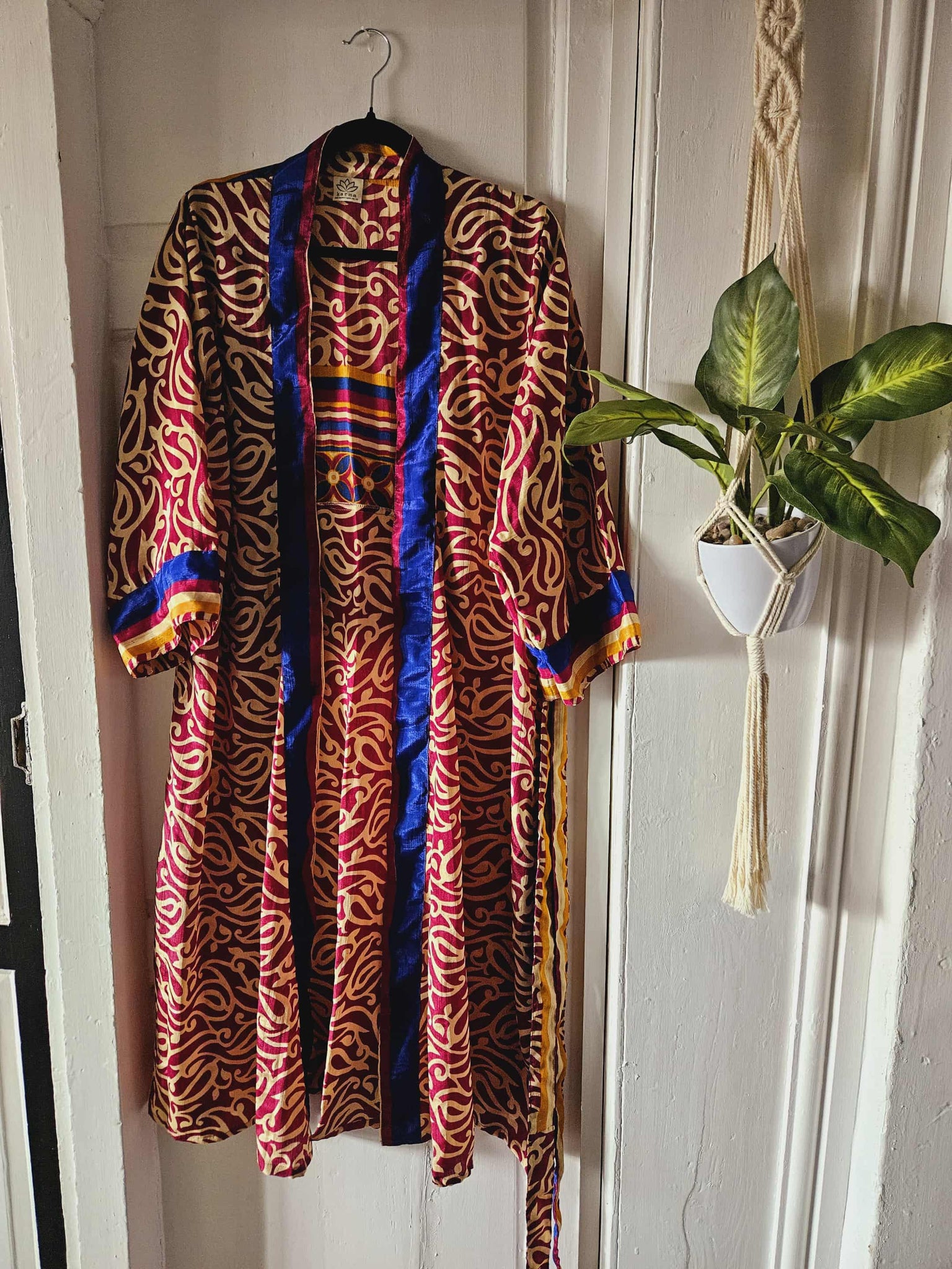 Crafted from repurposed traditional saris, each kimono tells a unique story. The vibrant colours and intricate patterns add a touch of bohemian elegance to any outfit, making them perfect for festivals, beach days, or casual outings. Whether worn over swimwear or paired with denim shorts and a tank top, our Sari Kimonos effortlessly elevate your summer style.